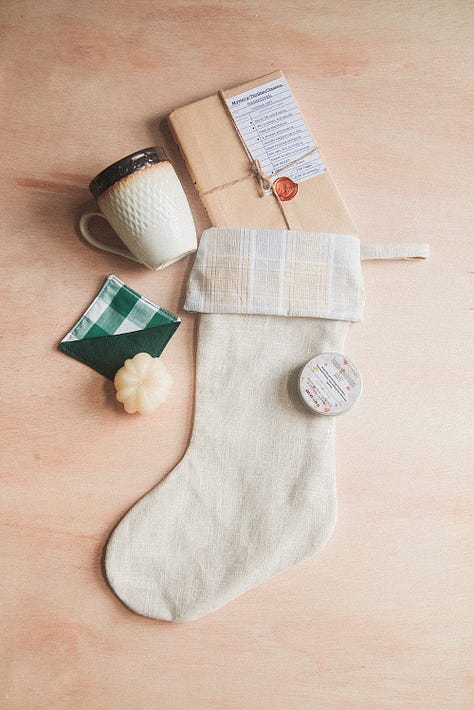 Stocking bundles with handmade, linen stockings stuffed full of bookish goodies!
